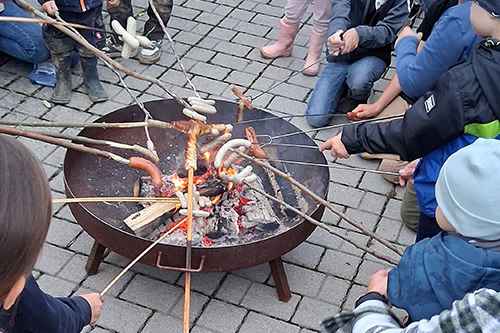 Auf dem Weg zum Feld konnten die kleinen Erdäpfelklauber, die bestens ausgestattet waren mit Eimern und Schaufeln, ihre Ernte einfahren. In der Zwischenzeit heizten die Mitglieder des Pfarrgemeinderats die Feuerschalen ein, damit die mitgebrachten Würstl auf ihren Spießen über dem Feuer gegrillt werden konnten. Zusätzlich wurden schon fertig gedämpfte Kartoffeln für die Familien angeboten. An der Wärme spendenden Feuerschale ließen schließlich alle gemeinsam den schönen Abend ausklingen.
